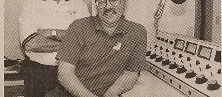 In the KJ-102 studio — Jack McDonald (left) and Jack Swanson (right), partners in Roseau’s new FM radio station, KCAJ, are pictured in front of a control panel in the broadcast studio of their radio station. McDonald will be in charge of the station’s sales, while Swanson will handle the news. If all systems are go, they will be on the air at 5 a.m. on Monday, June 10.