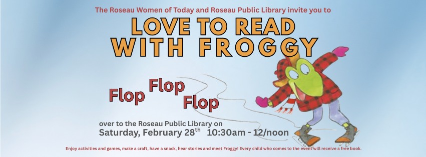 Flop, Flop, Flop into the Roseau Public Library to enjoy activities, games, craft, snack, hear stories, and meet Froggy! Every child who comes to the event will receive a free Froggy book!